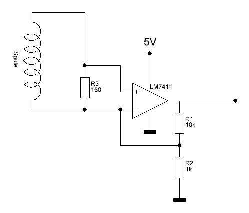 Hallo, in meinem Bekanntenkreis haben wir diskutiert, wie man einen einfachen Stromdetektor bauen könnte. Da wir allesamt Laien auf dem Gebiet der Elektronik sind, ist dabei natürlich nicht viel rausgekommen. Mein Vorschlag war folgender (siehe Anhang): In der Spule wird eine Spannung induziert und über den Operationsverstärker verstärkt. Was mit dem verstärkten Signal geschehen soll, wissen wir noch nicht. Die Vorschläge gingen von einer LED bis zum Relai. Die Spule ist eine Eisenkernspule (gewickeltes Eisenblech) mit 200 Windungen. Diese Spule habe ich bereits fertig bekommen. Wenn ich eine 220V Leitung durch die Spule führe kann ich mit dem Multimeter 0,12V am Widerstand R3 messen. Ich hab die Schaltung dann komplett aufgebaut, aber diese funktionierte wie erwartet nicht :-). Am Ausgang des OPs messe ich immer 5V, egal ob ein stromdurchflossener Leiter in der Spule liegt, oder nicht. Könnte mir jemand einen kleinen Hinweis geben, was ich falsch mache? Und wie gesagt, ich bin nicht gerade der Elektronik-Profi. Schönen Tag noch.