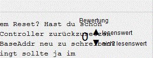 Hi ! Das Problem mit den ueberlagerten Bewertungen gibt es immer noch. Oft kann man den Beitrag nicht oder nur mit Muehe lesen. Vielleicht kann man ja die Bewertung ein wenig nach oben schieben, und neben Autor und Datum einblenden ? (HTML Experten an die Front !) Oder muss die Konsequenz nun sein nur noch als Gast unterwegs zu sein ? Und bitte nicht wieder mit einer Diskussion ueber Sinn und Unsinn der Bewertung vom Thema ablenken - dafuer gibt es einen anderen Faden ! ZigZeg