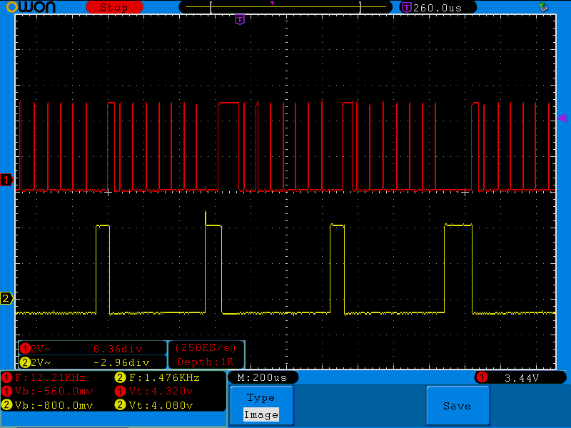 So jetzt hab ich ein Oszi (OWON SDS7102) zur Verfügung das ich auch mit nehmen konnte. Ich habe erstmal hier und dort etwas herumgemessen und bis auf eine Sache eigentlich nichts gefunden was mich verwundert hätte (wobei ich zuvor aber auch noch nie mit einem Oszi gearbeitet hab und folglich auch nicht weiß, was man vielleicht sonst noch so messen könnte, also Vorschläge sind willkommen ;) ). Kommen wir zu der einen Sache (siehe dazu Screenshot). Kanal 1 entspricht dem Q7, Kanal 2 dem Q0 des Shiftregisters der 8x20 Matrix, also dem Treiber. Die links zu sehenden Pulse sind wie erwartet: gleich lang und direkt aufeinander foglend. Bei der 2. Serie erkennt man aber deutlich, dass der Puls auf Q7 etwa doppelt so lang ist wie er sein sollte. Vorallem irritiert mich dieses Verhalten, weil das ja der Treiber ist, der eigentlich nur sturr in eine Schleife nach einander ein Bit durchs Register schiebt (bzw. je 8 Bits, aber die 1 ist immer eins weiter). Das Phanomän beschränkt sich auch ausschließlich auf Q7 alle anderen Pulse haben immer die richtige Länge (soweit ich das beurteilen kann). Das Auftreten schein mir auch zufällig zu seien. Einzige regelmäßigkeit, es scheint nie 2 dieser langen Pulse direkt hintereinander zukommen, es ist offensichtlich immer mindestens ein "richtiger" dazwischen. Und der Fehler tritt nur auf, wenn ein Treiber Pin mit einem Pärchen der "blauen" Pins (auf der Abbildung vom Post 15.06.2013 22:37) verbunden ist. Verbinde ich ein "grünes" Pärchen, nur einen Pin oder gar keinen Pin habe ich den Fehler nicht. Die eigentlich Störung (mehrfaches Auslösen einer MIDI Note) kann ich mir damit allerdings auch noch nicht erklären, da die nachfolgenden Pulse ja verschoben sind, somit kann ja nicht falsch sondern nur "später" ausgelesen werden, was ja eigentlich kein Problem sein sollte.