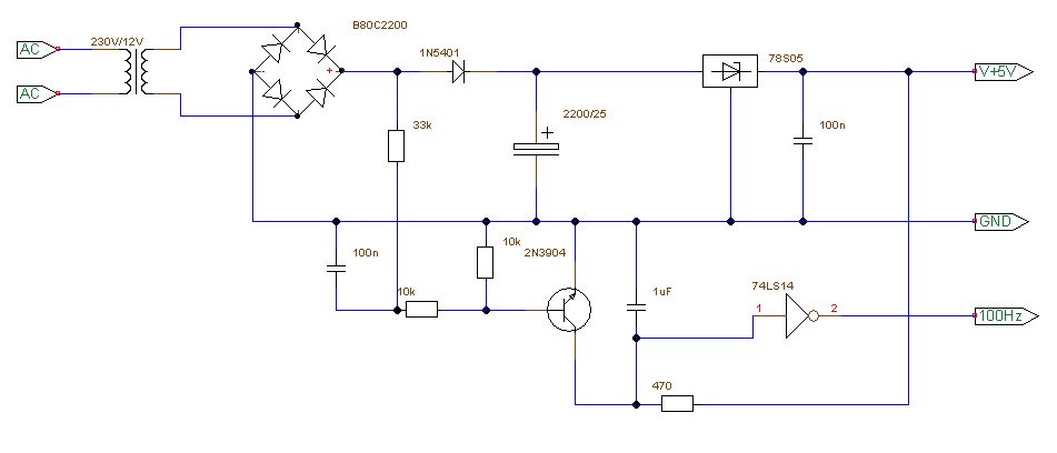 in dem man das Signal über einen Optokoppler entnimmt. dann sind Störungen weg. Wechselspannung ,Kondensator , Widerstand Optokoppler mit Paraleldiode und paralelel über beide Dioden so 330nF Kondensator um die neg Halbwelle durchzulssen. Wechselspannungspol Keine Elkos jo das ist alles Paul