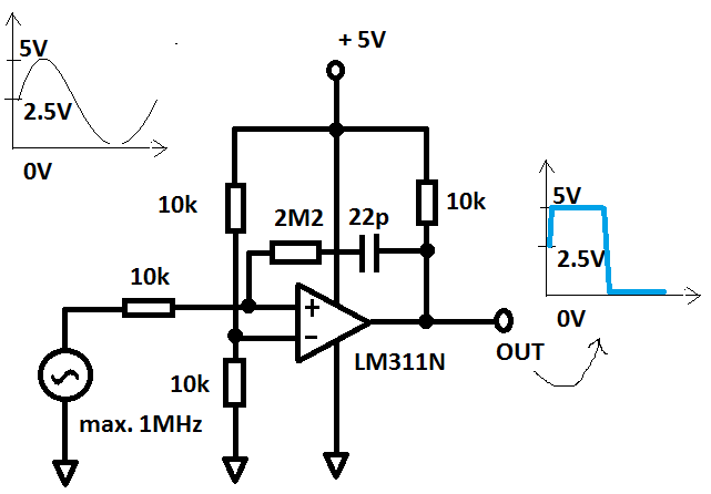 Sicher nicht. -Die Grenzfrequenz des LM 311 ist viel zu niedrig, um bei 1MHz richtig zu arbeiten. Anstiegs-bzw.Abfallzeit am Ausgang bewegt sich im Bereich von über einer Mikrosekunde. Schon bei 500 kHz bekommt man nur ein Dreieck als Ausgangssignal -Die Streukapazität parallel zum 2M-Widerstand dürfte viel zu groß sein. Bei z.B. 2pF Streukapazität parallel zu den 2M entsteht eine Grenzfrequenz von ca.40kHz - Der Widerstand 10kOhm am Ausgang ist für Digitalsignale mit 1MHz viel zu groß. usw. Eine bessere Lösung dürfte ein Inverter mit Schmitt-Trigger z.B 7414 sein.