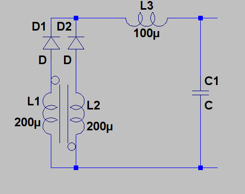 Johannes E. schrieb: > Hinweis: Wenn man bei einer Induktivität in LTSpice keinen ohmschen > Widerstand definiert, wird automatisch mit 1 mOhm gerechnet. Ich habe keinen definiert, das heißt, ich hätte 1mOhm in den Spulen und folglich müsste man den von dir beschriebenen Effekt sehen.1 Außerdem, bedenk doch mal: Es gilt auch meine Formel 2 oben. Die Differenz der Ströme in den Wicklungen ist konstant solange die Dioden leiten, weil die Spulen ja elektrisch parallel geschaltet sind. Stomänderung auf der 1. Spule => Spannung auf der 1. Spule => Spannung auf der 2. Spule => Stromänderung auf der 2. Spule.