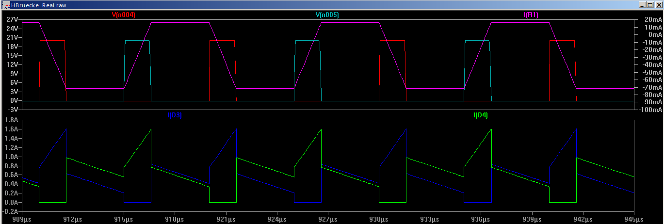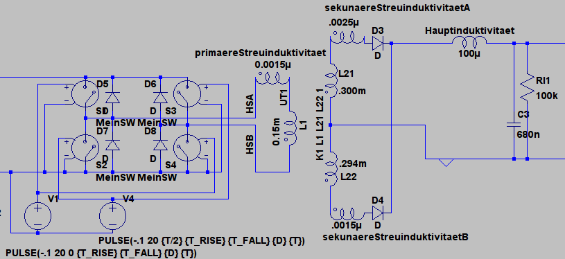 So, im Anhang noch ein Bild vom Ausgang der Simulation: Oben sieht man in türkis und rot die komplementäre PWM-Taktung der Mosfets. Unten den Stromverlauf durch die Dioden. Fallend ist der Freilauf. Oben ist in pink die Magentisierung des Trafos (1mA entspricht 1mT, Skala rechts. Trafo fährt in diesem Betriebspunkt leicht unsymmetrisch). Man kann sehen wie das Verhälnis der Ströme in den Sekundärwicklungen im Freilauf von der Magnetisierung des Trafokerns abhängt. Dafür suche ich einen Zusammenhang, also eine Formel. Edit: Die .asc geb mache ich ungern öffentlich, weil sie sehr viel mehr beinhaltet als nur diesen Trafokern. (Vielleicht werd ich sie im Sommer zur Verfügung stellen, wenn meine Arbeit abgeschlossen ist. Es gibt zu den Brückenwandlern nicht viel Literatur..) Die Simulation tut auch nichts zur Sache, weil man aus der Simulation eben nur den Effekt sieht, nicht die Ursache. Im Anhang noch ein Screenshot der relevanten Teile.