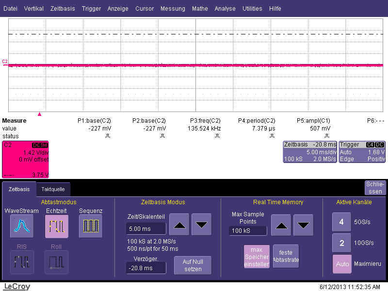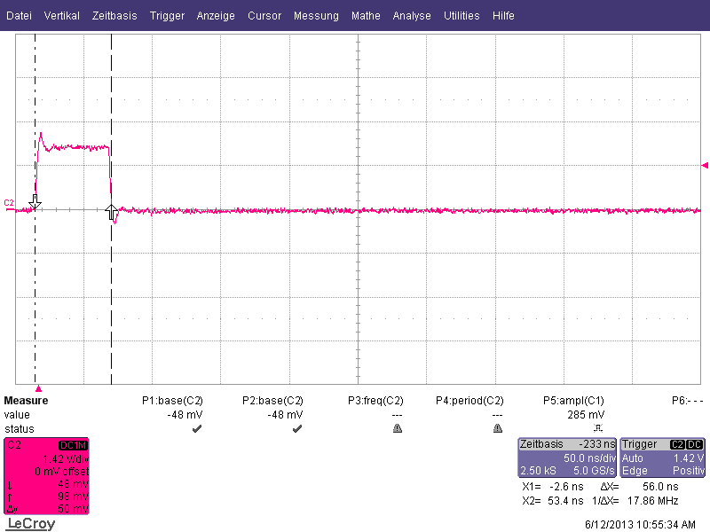 Doch da kommen mehre clocks. Es handelt sich definitiv um ein kontinuierliches Signal welches die Framerate eines Sensors steuert. Wenn ich z.B. 360 Hz einstelle, bekomme ich das gerade so noch getriggert. Alles unter 200 Hz verschluckt mein Oszi aber. Wenn ich 10 ms einstelle, sieht man auch das da mehrere clocks kommen, allerdings springt die Anzeige dan so stark, das die Messung nicht zu gebrauchen ist. Ich habe hier das LeCroy WaveRunner 104Xi-A 1 GHz, 4ch, 5 GS/s, 12.5 Mpts/Ch (10 GS/s, 25 Mpts/Ch in interleaved mode) Single-Shot Sample Rate/Ch 5 GS/s on 4 Ch 10 GS/s on 2 Ch Random Interleaved Sampling (RIS) 200 GS/s, user selectable for repetitive signals (100 ps/div to 10 ns/div) Maximum Trigger Rate 1,250,000 waveforms/second (in Sequence Mode, up to 4 channels) Intersegment Time 800 ns Standard Memory (4 Ch 2 Ch 1Ch) (Number of Segments) 12.5 M 25 M 25M (10,000) => Ich messe auf Kanal 2! Das Signal ist auf die System-Clock synchronisiert, welche 148.5 MHz besitzt.