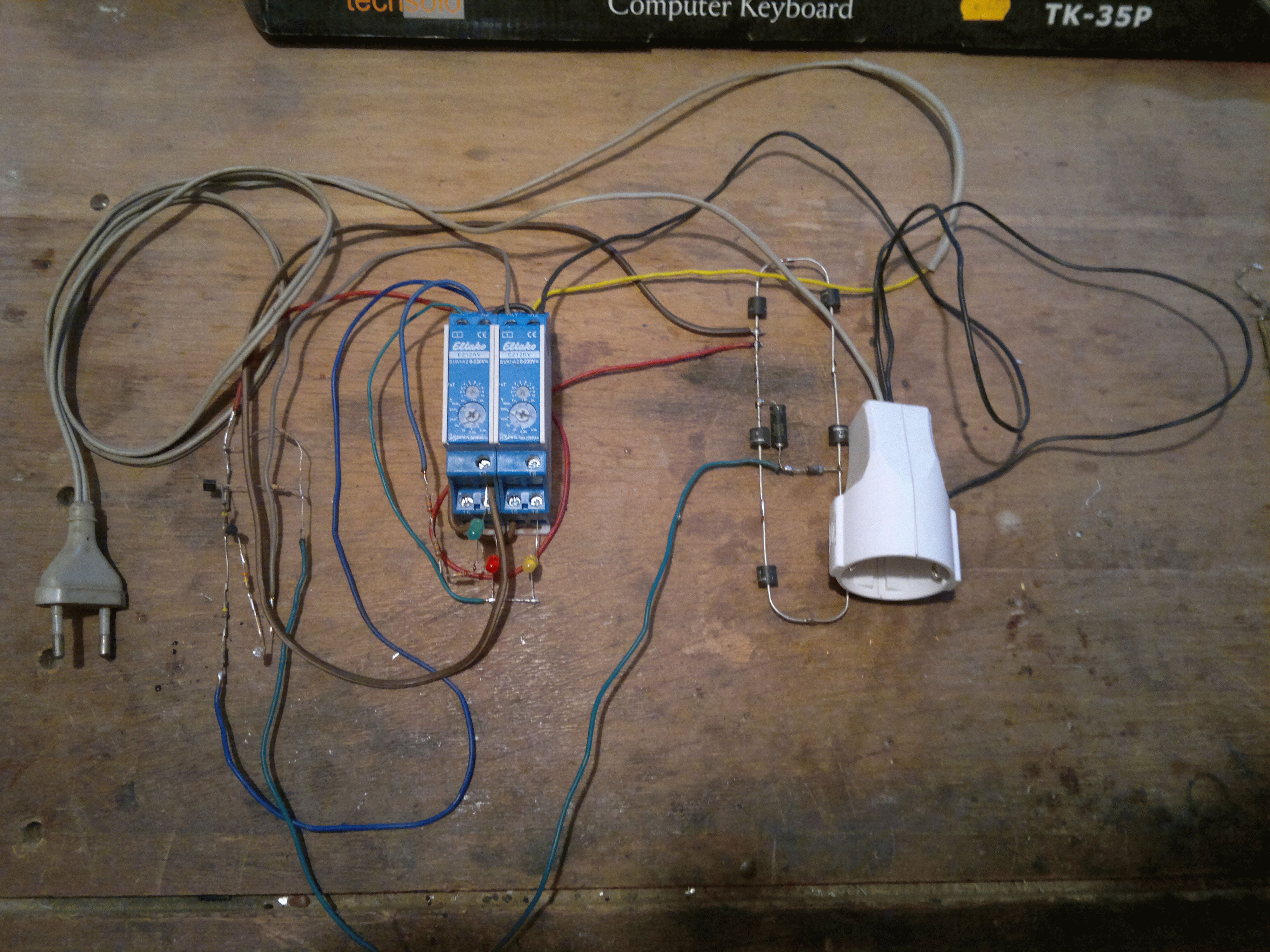 @Matthias. Dein Rohrbruchproblem ist genauso auch meines wie der leergepumpte Brunnen! Bei mir sind es die Schläuche, die teilweise auf dem Hof in der Sonne liegen und platzen! Bisher waren es immer nur kleine Risse aber wenn‘s mal richtig platzt pumpt die Pumpe bis zum jüngsten Tag. All das wäre aber mit so einem einzigen Abschalttimer zu verhindern. Wie schon beschrieben hab ich hinter dem Druckschalter 'ne Steckdose. Also würde mir hier sogar die einfache Variante ohne Stromsensor völlig ausreichen. Wenn man allerdings davon ausgeht daß die Pumpe bei 'nem Rohrbruch ständig ein- und ausschaltet wäre die universelle Kaffeemaschinenabschaltung natürlich wieder perfekt und auch nötig. @Peter Die meisten Pumpen, und vor allem die Hauswasserwerke!, arbeiten heutzutage mit 230V. Ich hatte früher 'ne alte Drehstrom Kreisel drin, irgendwann hab ich die durch ne 5 stufige Inox 1300W 5,8A Kreiselpumpe aus dem Baumarkt ersetzt. Die braucht nur noch eine Phase und hat den Kessel wesentlich schneller voll. Die Eltakos machen 10A. Das billigere Pendant von Conrad CMFR66 macht 16A. Also überhaupt kein Problem! Hab ich alles hierliegen, nur hapert‘s an Lust und Zeit für 'nen professionellen Aufbau. Ich würde das lieber fertig kaufen. Es mag Spezialfälle geben aber die sind doch verschwindend gering! (hohe Stanbyleistung, wofür bräuchte ich dann die automatische Abschaltung? der Einschaltknopf braucht so wenig Strom, daß der zum Auslösen sicher nicht reicht, und wieviel Drehstromgeräte hat man wohl im Haushalt??) Mir fällt keiner ein und wenn sich doch einer findet, dann nehm ich’s dafür nicht!! Oder hast du schon mal einen Blitzschutzveteiler oder 'ne Master Slave Schaltung für Drehstrom im Handel gesehen? Oder eine die sich um 'nen Einschaltknopf oder hohen Standbystrom schert? Das ist doch Krümelkackerei. Meine 6 Dioden benötigen keinen Kühlkörper! Ich hab‘s mit Bügeleisen getestet, ich glaub die werden kaum warm. Auch gehört eigentlich gar nicht viel dazu und wenn man es industriell als eine Schaltung aufbauen würde, wäre es sicher nicht viel größer als ein Sicherungsautomat, vllt doppelte Breite wegen den Dioden. Als Steckdosenadapter sollte es kein Problem sein. Den meisten Platz brauchen dann die Dioden und das Relais. Anbei das Foto vom Schnellaufbau mit handelsüblichen Bauelemnten, deshalb etwas zu groß für 'nen Steckdosenadapter. Rechts die 6 Dioden als Stromsensor...