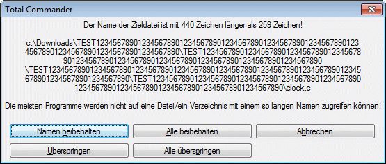 g. c. schrieb: > > Kann man so allgemein nicht sagen bzw. gilt für die ANSI-Funktionen, > aber nicht für die entsprechenden in UNICODE. Dort sind Pfadangaben auf > 32767 Zeichen beschränkt. Empfiehlt sich aber wohl nicht das > auszureizen. Der Explorer kommt damit nicht zurecht und gibt > Warnhinweise. Der Total Commander beispielsweise kann aber Verzeichnisse > erzeugen, die weit über die 260 Zeichen hinausgehen und auch darauf > zugreifen. Genau das war schon einige Male mein Problem. Ich kann ohne TC fast nix am PC, doch wenn man dann mit dem selben TC Verzeichnisse synchronisiert, stolpert er selber über seine zu langen Verzeichnisfiefen. Dann geht nämlich ab dem 257. Zeichen nichts mehr. "Festplatte voll..." ist noch die harmloseste Meldung ;-) Old-Papa