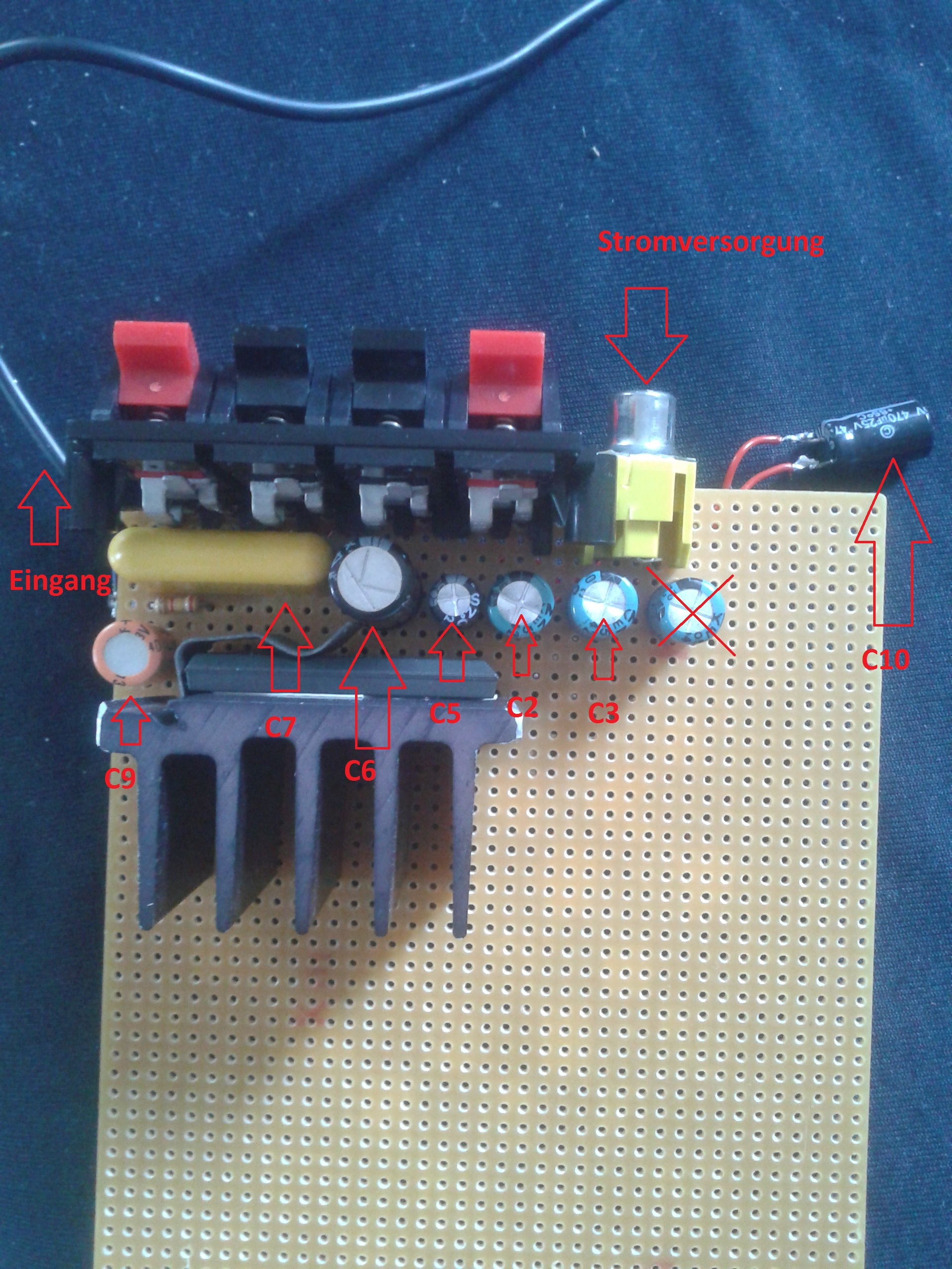 Also ich hab jetzt mal einen 10k Widerstand zwischen Input und Masse gelötet, ändert sich aber nichts. Langsam bin ich am verzweifeln, ich hab auch schon alle Kondensatoren gemessen, und laut Messgerät sind alle OK. Was können noch Gründe sein?
