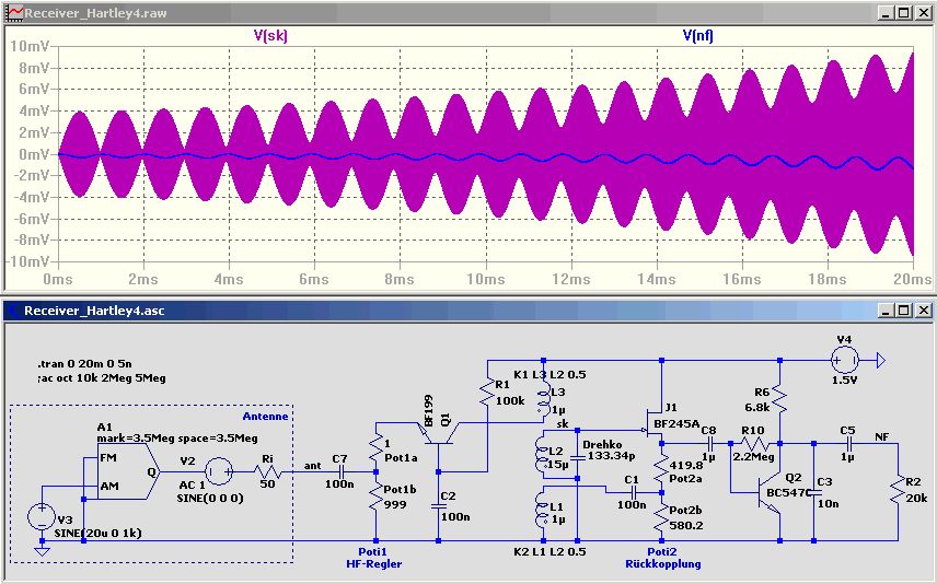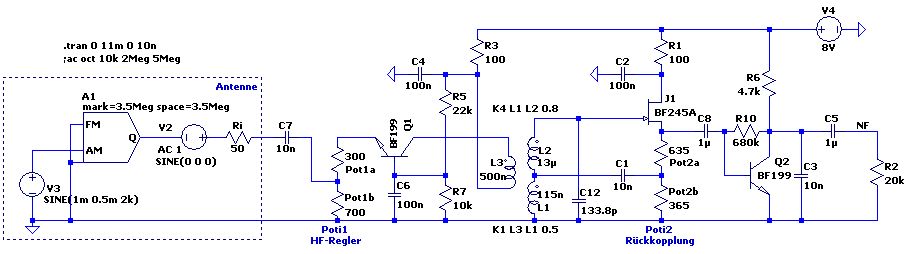 Hallo Mast Pendelschwingungen entstehen durch Gleichrichtung der HF an der BE-Strecke des VT2. Das Problem kann beseitigt werden, indem C5 so klein als möglich aber gerade noch groß genug für die Rückkopplung ausgelegt wird. C5 sollte deutlich größer als die Basis-Kapazität sein, da sonst die Rückkopplung bei hohen Frequenzen früher einsetzt. Da diese ca. 20pF beträgt, würde ich 100pF für einen ersten Test wählen. Ansonsten ist die Trennung von Oszillator und Demodulator die bessere Lösung. Die Arbeitspunkte können unabhängig voneinander eingestellt werden und beeinflussen sich gegenseitig nicht. Dann hat ein Rückkoppel-Empfänger noch die Eigenschaft, dass er sich vom empfangenen Signal einfangen lässt. Die Eigenschwingung rastet regelrecht auf den Träger ein. Diese Tendenz ist proportional zur Stärke das Empfangssignals und umgekehrt propotional zum Abstand eines Signals zur Eigenresonanz und zur Rückkopplungseinstellung. Jetzt ist diese Eigenschaft ja für AM ganz angenehm, aber es stört bei CW und verhindert den Empfang eines kräftigen SSB-Signals. Das Problem kann man deutlich reduzieren, indem das NF-Poti voll aufgedreht und die Lautstärke mit einem HF-Regler eingestellt wird. Dann kann noch die Rückkopplung etwas stärker angezogen werden und für CW sollte eher ein hoher Seitenband-Ton von ca. 1kHz gewählt werden. Gruß, Bernd