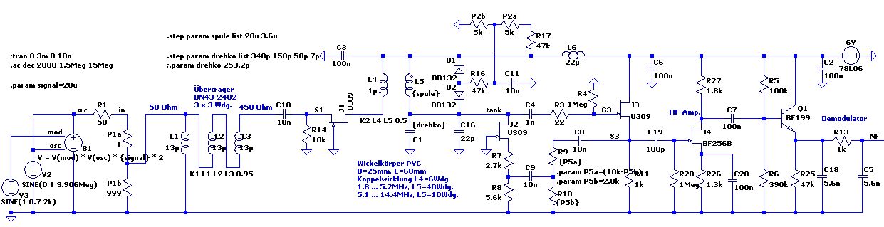 Hallo Gerri > probehalber eine Domodulator-Wicklung an der Schwingkreisspule > hinzufügen und dort über C19 ganz normal den HF-Amp. und die > Demodulatorstufe anschließen. J3 wirkt ja schon als Puffer zwischen Schwingkreis und Demodulator. Besser kann das kaum noch entkoppelt werden. C19 an einer Koppelwicklung würde den Schwingkreis unnötig bedämpfen. Momentan hat die Schaltung vier Probleme: 1. Die eingekoppelte HF steigt in Richtung hoher Frequenzen an. Da werde ich versuchen, am Wochenende eine Lösung zu finden. Das Problem muss erst mal genauer simuliert werden. 2. Die Rückkopplung kommt bei hohen Frequenzen früher Dies könnte mit Punkt 1 zusammenhängen. - Die Rückkopplung setzt nicht weich genug ein Entweder muss ein anderer Arbeitspunkt eingestellt werden oder ich steige auf eine Hartley-Schaltung um. - In der Nähe des Schwingungseinsatzes erzeugt der Oszillator niederfequentes Rauschen Im Original-Schaltplan ist C4 viel kleiner. Andererseits hätte ich vermutet, dass mit großem C4 das Rauschen kleiner wird. > Du hast ein ECO-Audion aufgebaut? Version 1 oder 2? Ich versteh die Frage nicht, was ist Version 1 bzw. Version 2? Ich hab verschiedene Varianten aus Ein- und Zweikreisern getestet und auch ein Kaskoden-Audion. Die Kaskode war nicht schlecht, aber das Eco war besser. Die Leistung nimmt mit höherer Betriebsspannung zu, aber der Schwingungseinsatz wird oberhalb 40-45Volt allmählich apruppter. Die Wald- und Wiesenröhre EF80 funktioniert mit am Besten. Auch beim Zweikreiser bin ich bei der Kopplung steckengeblieben bzw. es fehlt noch der richtige Durchbruch für ein brauchbares Gerät auf 20m. Das Signal muss wirklich effektiv zurückgeregelt werden können, ohne das sich die Empfangsfrequenz verstimmt, dann geht es auch auf 20m.