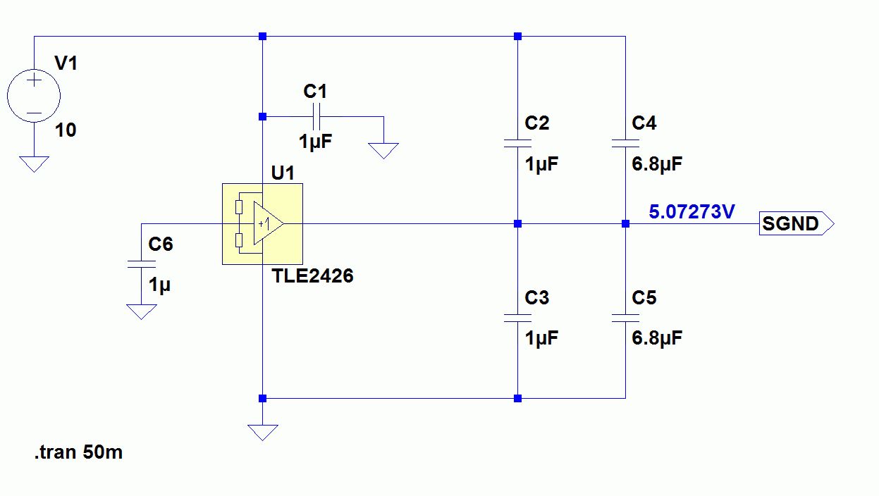 Jetzt habe ich den TLE2426 verwendet, kann aber das Ergebnis nicht nachvollziehen. Habe mal Schaltplan und Simulation hinzugefügt. Vielleicht weißt du was da falsch läuft. In der obigen Schaltung (Bild) wird doch die Spannung von 12V einfach nur auf 10V reguliert. Also habe ich einfach eine 10V Quelle genommen. Jetzt verstehe ich jedoch nicht, wie der SGND höher sein kann. SGND sollte eigentlich um die 5V betragen