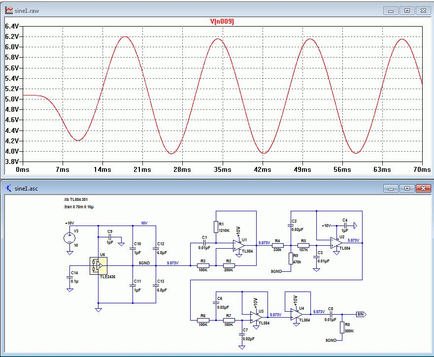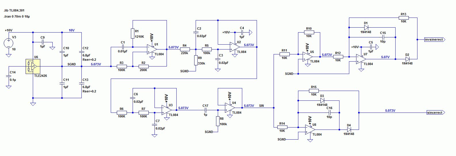 Ja okay, das macht Sinn. Ich sehe schon, da werden noch mehrere Fehler drin sein. Mein Ziel ist eine Schaltung zu simulieren entsprechend Anhang. Nun habe ich mein SGND, meine GND und mein Vcc=10V. Wenn ich jedoch zum Sinus-Oszillator komme, will die Simulation nicht funktionieren, oder benötigt sehr lange (breche nach mehreren Minuten immer ab). Bei meiner Simulation (Anhang) habe ich noch ein Problem mit den Steuerungs-Anschlüssen der Op's. Vielleicht kannst du mir da aushelfen? In der Praxis sind es ja 4er Op's. Also 4 auf einem IC. Steuer ich jetzt alle Op's in LTSpice gleich an, also so wie an U2, oder wie gehe ich da am Besten vor?