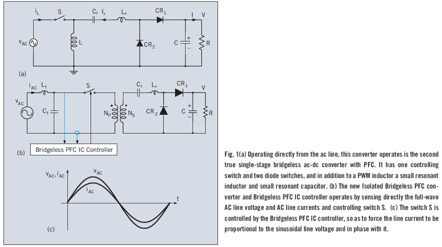 Ich verstehe jetzt wie die Schaltung funktionieren soll, kann sie aber noch nicht erfolgreich simulieren. Die im Link (http://powerelectronics.com/regulators/single-stage-isolated-bridgeless-pfc-converter-achieves-over-98-efficiency-0999-power-fac) geschilderten Strombilder stimmen nicht. Darin sieht man Diskontinuitäten im Strom, die wegen der Induktivität der Spulen nicht möglich ist. L1 kann man für hohen Frequenzen als Konstantstromquelle mit wert I sehen. Der Trick besteht darin, dass man S öffnet, sobald der Strom durch Lr gleich ist an I. Dann entstehen keinerlei induktiven Spitzenspannungen, weil S am Schaltmoment schon stromlos ist. Durch Lr fließt jetzt der konstante Strom I, über Lr steht also keine Spannung mehr! Cr wird also linear aufgeladen, und die Spannung am Knotenpunkt Lr/L/S nimmt linear ab. Nach einiger Zeit schaltet man S wieder ein. Die Spannung über Cr resoniert mit Lr. Die Spannung über Cr steigt weiterhin an (in Unterschied zum im verlinkten Artikel geschilderten Spannungsverlauf), der Strom durch Lr/Cr fallt ab (aber keineswegs diskontinu, wie im Artikel). Der Strom durch Lr/Cr wird negativ, Spannung über Cr fällt ab bis null. Dann ist der Strom durch Lr/Cr maximal negativ, und steigt wieder an. Spannung über Cr wird negativ, und wenn I(Lr) wieder null ist, is Cr maximal negativ aufgeladen. I(Lr) steigt weiter, und sobald sie größer wird als I(L), öffnen wir S wieder, und das Ganze wiederholt sich von vorne an. Das rechtzeitige schließen von S ist einfach, wenn man einen Reverse Blocking Switch nimmt. Das ganze Konzept ist genial; ich verstehe dass der Autor Patent beantragt hat. MfG Henk --- Mein Deutsch ist nicht perfekt. Es ist auch nicht meine Muttersprache...