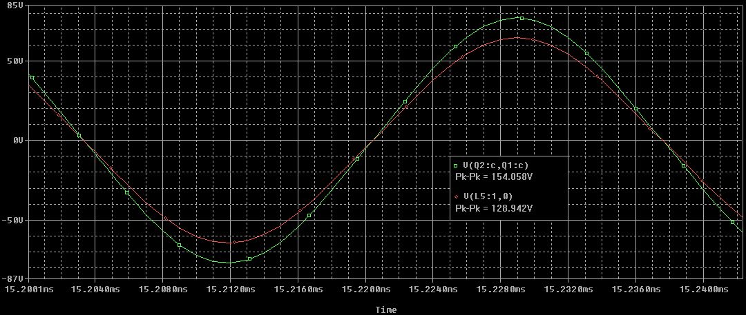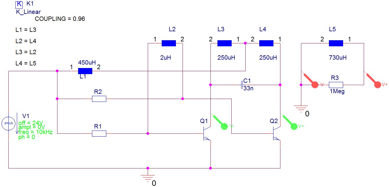 @Vitalij (Gast) >Hab es nach dem Prinzip gemessen und erhalte als Koppelfaktor 0,966: >passend zur Simulations. Das klingt schon besser! >In der nähe der Spulen sind keine metallischen Objekte. Spannung mit dem Oszi falsch gemessen? Vorsicht! Wenn man die Primärspannung an den Kollektoren der Transistoren gegen GND misst, sieht man nur jeweils eine Halbschwingung! Die Spizze-Spitze Spannung ist logischerweise DOPPELT so groß. >Dann bleibt doch nur noch die Schaltung übrig, werde die mir genauer >Unter die Luppe nehmen. Erstmal muss du deinen Messfehler aufklären. Denn Faktor 2 ist keine Frage der Genauigkeit sondern ein prinzipieller Messfehler. Aber wozu soll die Anordnung gut sein? Bei 0,1mm Abstand ist dort nur eine Folie dazwischen. Da lohnt sich auch keine Kompensation der Streuinduktivität.