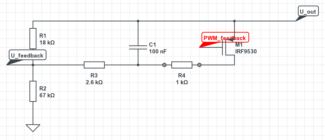 Hallo, ich möchte gerne einen fertigen Schaltwandler mit einem mikrocontroller fernsteuern. Dafür werde ich den feedback pin manipulieren und hätte gerne die Bestätigung, dass ich alles richtig gerechnet habe. Konkret geht es um ein KIM-3R35 Modul mit Uer_out=3,3V, I_out=5A. Verwendet wird ein TPS40057 IC (http://www.ti.com/lit/ds/slus593h/slus593h.pdf) welcher 0,7V an seinem feedback pin erwartet. Dafür möchte ich eine PWM aus meinem mikrocontroller mittels RC-Filter glätten und damit den unteren Teil des Feedback-Spannungsteilers überlagern. ------------------------------------------------------ Erstmal die Konfiguration für 3,3V: R1 = 620kΩ + 75kΩ = 67,145kΩ, R2 = 18kΩ. Für U_out = 3,3V bedeutet das U_feedback = R2 / (R1 + R2) * U_out = 18kΩ / (18kΩ + 67,145kΩ) * 3,3V = 0.211 * 3,3V = 0.6976V Ich kann also zumindest die orginale Konfiguration nachvollziehen. ------------------------------------------------------ Angenommen ich möchte eine Ausgangsspannung von maximal 16V für meinen Bleigelakku einstellen können. Dann wäre der Spannungsteiler U_feedback / U_out = R2 / (R1 + R2) 0,7V / 16V = R2 / (R1 + R2) 0.04375 = R2 / (R1 + R2) -> R2 = R1 / ( U_out / U_feedback - 1) = 67,145kΩ / (16V / 0,7V -1) = 3071Ω D.h. der 18kΩ Widerstand muss durch einen 3kΩ Widerstand ersetzt werden, um ungefähr auf 16V zu kommen. ------------------------------------------------------ Den orginalen R2=18kΩ möchte ich gerne drinnen lassen. D.h. ich muss meinen RC-Tiefpass parallel zu R2 schalten. Der Ersatzwiderstand wäre dann 1/3kΩ = 1/R2 + 1/R_ersatz 1/R_ersatz = 1/3kΩ - 1/R2 -> R_ersatz = 1 / (1/3kΩ - 1/R2) = 1 / (1/3kΩ - 1/18kΩ) = 3600kΩ. D.h. wenn ich zu meinen 18kΩ einen 3,6kΩ Widerstand parallel schalte, erhalte ich am Ausgang meines Wandlers ca. 16V. ------------------------------------------------------ Jetzt ein Punkt an dem ich mir unsicher bin: Ich werde die Ausgangsspannung über einen pfet schalten. Das kommt dann auf einen RC-Tiefpass bestehend aus 1kΩ und 100nF. Bei 250kHz der PWM reicht das locker aus. Um auf 3,6kΩ zu kommen baue ich dahinter noch 2,6kΩ. Kann das so funktionieren?