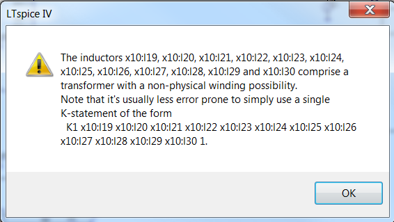 Hallo, Du hast wahrscheinlich einen Trafo mit 3 oder mehr Spulen definiert. Der einfachste Fall die Kopplung zu definieren wäre K1 L1 L2 L3 L4 ... 0.95 Damit wären alle Spulen gleich gut untereinander gekoppelt. Damit gibt es nie Probleme. Wenn du aber jetzt unterschiedliche Kopplungen definierst hast, dann hast du eine nicht realisierbare Kopplung definiert, wenn diese Fehlermeldung kommt. K1 L1 L2 1 K2 L1 L3 1 K3 L2 L3 0.5 Das wäre nicht realisierbar. Diskussionen und Hinweise wie dieser Check funktioniert gab es mal in der LTspice Yahoo group. Gruß Helmut