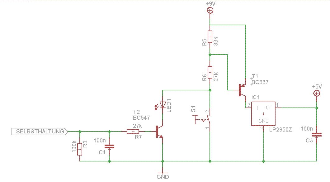 Nochmals: Nehmen wir MEINE Schaltung: Wenn man den Taster betätigt, wird T1 durchgesteuert. Der uC bekommt Spannung und legt sofort "Selbsthaltung" auf High. Dadurch steuert T2 durch. Die Schaltung läuft. Die Schaltung wird nicht mehr benötigt: "Selbsthaltung" wird auf Low gelegt. T1 sperrt wieder. Habe ich da einen Denkfehler?