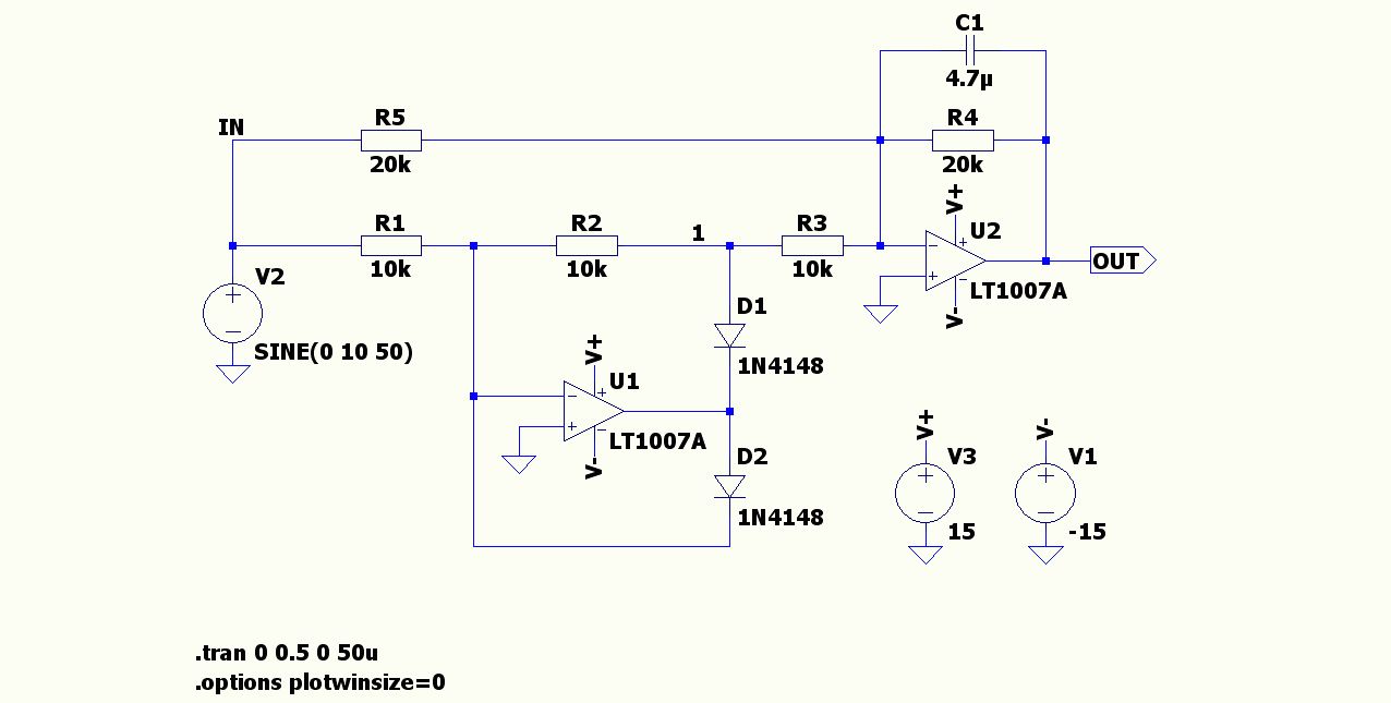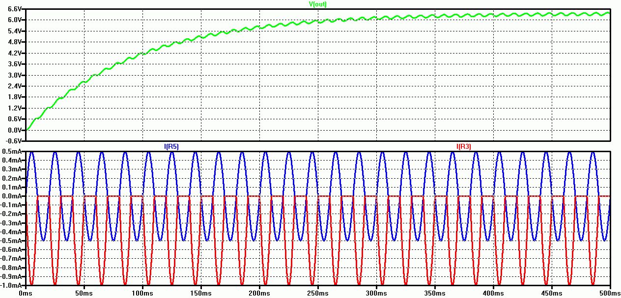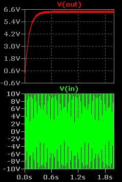 Hier mal die Auflösung des Rätsels. Schau die dir die Ströme I(R5) und I(R3) an. Dort sieht man das Prinzip. Man addiert den doppelten Wert des Halbwellengleichrichters zur normalen Sinusspannung um eine Doppelweggleichrichtung zu erzielen. Der Kondensator glättet die gleichgerichtete Spannung. Je größer man den Kondensator wählt um so kleiner wird die Restwelligkeit aber dafür wird dir Einschwingzeit länger. Da muss man einfach einen Kompromiss machen.