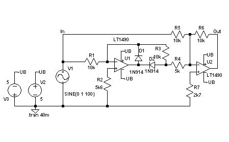 Hallo, ich muss für die Uni einen Präzisionsgleichrichter (welcher Gleichrichter ist freigestellt) in LTSpice simulieren. In den Vorlesungen behandelten wir nur einfachen Schaltungen, welche Bauelementen wie Spulen, Widerstände, Kondensatoren usw beinhalten. Warum unser Professor uns eine solche Aufgabe gibt verstehe ich nicht (nebenbei studiere ich Wirtschaftsingenieurwesen und nicht E-Technik). Habe mir aus dem Internet einen Schaltplan gedownloadet und versucht zu simulieren. Ich schreibe demnächst meine Prüfungen und schaffe es deshalb nicht tiefer in das Programm einzusteigen. Es wäre sehr nett, wenn ihr mir den Grund des Fehlers "Unknown subcircuit called in:...." nennen und beheben könnt. Es liegt auf jeden fall am Verstärker, habe dort auch keine Eingaben gemacht. Schon mal danke im Voraus! Die Dateien sind im Anhang. Mit freundlichen Grüßen Philipp