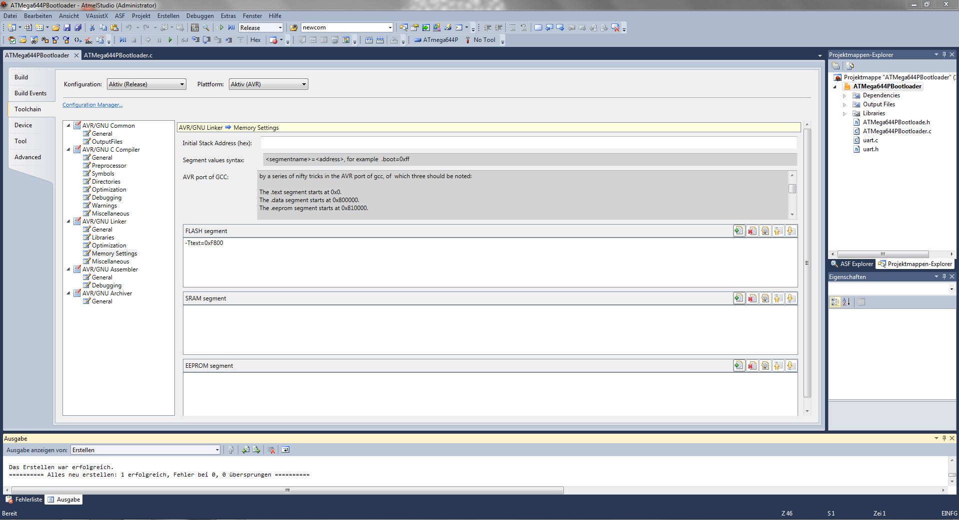Moin moin, bin gerade dabei einen Bootloader für den ATMega644P nach dem Artikel "AVR Bootloader in C - eine einfache Anleitung" http://www.mikrocontroller.net/articles/AVR_Bootloader_in_C_-_eine_einfache_Anleitung zu basteln. Eigentlich ist alles fertig, ich muss noch den Linker auf die Adresse 0xF800 verschieben. Und da ist das Problem. In dem Artikel wird leider das AVR Studio 4 benutzt, wo der Linker Parameter auf -Ttext=0x1800 gesetzt wird. Leider kennn ich mich nicht mit diesen Compielereinstellungen aus und im Atmel Studio 6 sieht alles anders aus. Kann mir einer beschreiben oder einen Screenshot schicken, wie ich das einstelle? Hoffe ihr könnt mir helfen LG Hauke