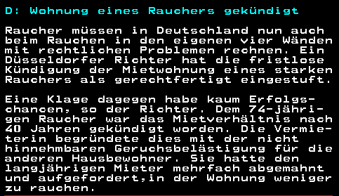 Die Verweigerung der Prozeßkostenhilfe gegen den 74-jährigen ist gekippt: Entscheidung in Düsseldorf: Gericht stärkt Raucher im Kampf gegen Wohnungskündigung http://www.spiegel.de/wirtschaft/service/landgericht-gewaehrt-raucher-nach-kuendigung-der-wohnung-kostenbeihilfe-a-910351.html Womöglich war das "starke Rauchen" des Herrn nur ein Vorwand, um ihn rauszuschmeißen.