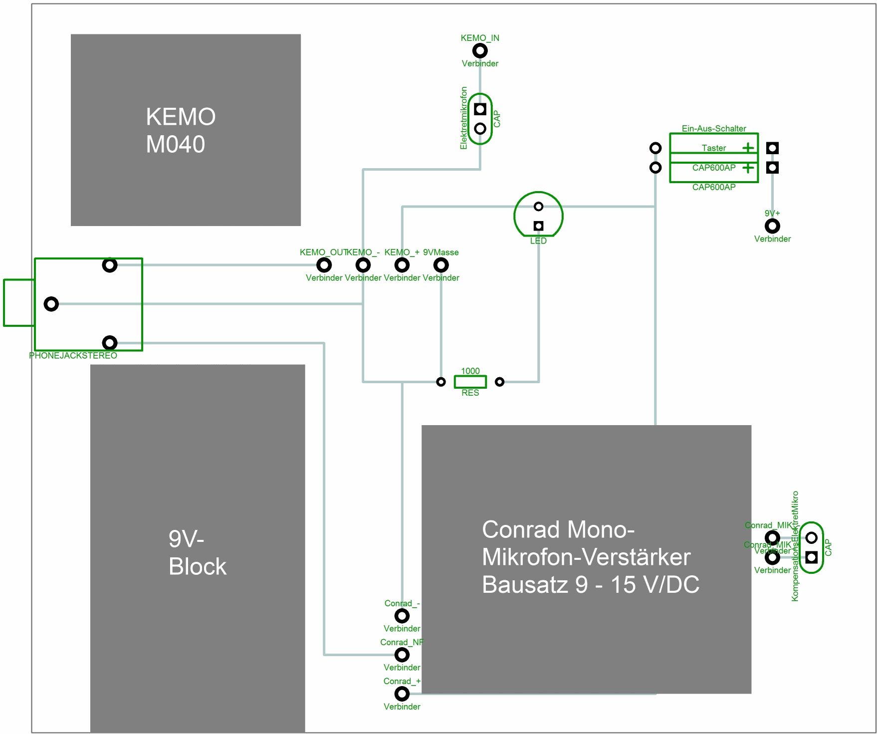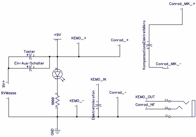 Ich habe den Kemo #M040 erworben. Die Schaltung sieht wie angehängt aus. Verhalten: Der dem Conrad Verstärker zugewiesene Audiokanal funktioniert, Signal wird erwartungsgemäß verstärkt. Der dem Kemo Verstärker zugewiesene Audiokanal funktioniert nicht, kein in Verbindung zum Eingangssignal meßbares Signal vorhanden. Gerne kann ich genauere Meßwerte liefern, wenn nicht bereits ein Fehler in der Beschaltung liegt. Beide Elektretmikrofone funktionieren. +9V heißt konkret ca. +8,87V.