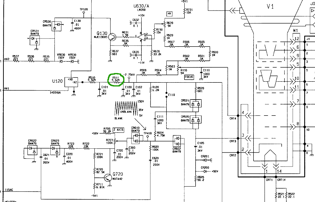 Hallöchen! Ich benötige jetzt die Hilfe von HV/Oszilloskopröhren-Experten :-) nachdem mein Unternehmen (bzw. ich ;-) nun stolzer Besitzer eines Tektronix 2712 (9kHz-1,8GHz Spektrumanalyzer) ist, geht es nun an die Reparatur eines "Schönheitsfehlers" des Geräts. Soweit funktioniert das Teil einwandfrei nur ein leichtes "Flackern" des Bildes nervt mich. Ja, ich bin da Pedant: ich möchte diesen Fehler gerne beheben :-) Vielleicht erst einmal zur Fehlerbeschreibung: 1. Das Bild ist manchmal zu "groß" für den Schirm, die Größe schwankt (meist nach dem Einschalten) um etwa 1cm, und zwar immer in Höhe und Breite gleichzeitig, das Bild "pumpt" quasi und zittert in diesem Bereich - allerdings recht zufällig. Es kann also kurz auf die korrekte Größe schrumpfen und bläht sich dann wieder auf Gleichzeitig ist die Helligkeit reduziert und man muss die Intensität recht weit aufdrehen. Das Ganze wird besser, wenn das Gerät warm ist - ich hatte es aber auch schon, dass das Bild direkt beim Einschalten perfekt war und blieb. In 95% der Fälle ist es aber zumindest etwas zu groß und flackert leicht, bis das Gerät sich erwärmt hat. Ok, die Analyse ergab bisher Folgendes: Netzteilspannungen sind alle da - nur die HV-Versorgung mit 1400V konnte ich nicht messen, da ich hier leider keinen HV-Tastkopf habe. Ebenso sind die Signale für Horizontal- und Vertikal-Ablenkung da (auch beim "Pumpen" unverändert), so dass ich das ausschließe. Alle Einstellungen wie Focus, Astigmatismus, Drehung, Horizontal- und Vertikalposition lassen sich sauber einstellen. Für mich blieb also nur eine kalte Lötstelle/Riss etc. im Bereich der Hochspannung. Beim Einschalten des geöffneten Geräts fiel mir dann auf, dass es im HV-Bereich einen kleinen Funkenüberschlag über einen 1206-Widerstand gab - genau am Ausgang der Verdopplerschaltung (1400 -> 2800V) für die Spannung der Kathode/Wehneltzylinder(?). Der entsprechende Widerstand R511 (grüner Kringel) sieht auch nicht mehr gesund aus (Beschriftung ist weg, R510 hat sie noch), so dass ich mal stark davon ausgehe, dass der hin ist. Die Lötstellen in dem Bereich habe ich auch schon alle nachgelötet, kalt dürfte da also nichts mehr sein. Ich habe mal den relevanten Ausschnitt des Schaltplans angehängt. U120 ist die Kaskade mit 11kV für die Anode und -2,8kV für die anderen Elemente. Der OP U630 dient mit dem Trimmer R639 der Regelung und Einstellung der Hochspannung, allerdings tut sich da auf dem Schirm nichts (zumindest nichts optisch sichtbares). Ist das so ok? Beim Einschalten scheint ja die Hochspannung an R511 zu gelangen - ich vermute mal, dass sie dann auf die noch entladenen 3kV-Kondensatoren überschlägt und diese lädt. Ich vermute, dass R511 nicht ganz hin ist, sondern je nach Temperatur noch leicht leitet, und so eine Hochspannung an die Gitter abgegeben wird, aber eben sehr wackelig und stark von äußeren Einflüssen gesteuert. Nun bin ich leider nicht der Röhrenfreak, aber mich würde doch interessieren, wie dann das Fehlerbild zustandekommt und ob der Widerstand (hoffentlich) die einzige Ursache ist. Liege ich soweit richtig? Vielleicht kann dazu jemand eine Einschätzung geben. Sonst sind wir hier sehr zufrieden mit dem Gerät - nur dieser kleine Makel stört noch :-) Vielen Dank für jede Hilfe, Chris P.S.: Der Widerstand ist schon geordert (den habe ich leider nicht hier und für Frickeleien ist mir das da im HV-Teil zu heikel).