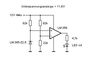 Hier mal eine bewährte Schaltung aus meinem Pool. Die Spannungsreferenz LM385-Z2,5 (Bandgap) arbeitet hier wie eine Z-Diode und funktioniert im Prinzip auch so, liefert aber eine überaus stabile Referenzspannung von 2,5V bei einer wahrhaft knauserigen Bestromung von 100µA über den 82k. Der Spannungsteiler 82k / 22k ist so berechnet, dass bei einer Akkuspannung von 11,8V ebenfalls 2,5V für den Vergleich am Minus-Eingang des OpAmp anliegen. Der wiederum geht dann am Ausgang auf 'high' und bringt die LED zum leuchten, wenn die Akkuspannung unter 11,8V geht. Ich habe mal den Vorwiderstand der LED auf 4,7k gesetzt; das ergibt einen Strom von 2mA für die LED (Standard-Typ 20mA). Dabei ist sie für mein Empfinden hell genug und strapaziert den Akku nicht noch unnötig, wenn der schon fast leer ist. Der Gesamt-Strombedarf der Schaltung liegt bei 1,2mA (LED off) und bei 3.2mA (on). Ich habe mal versuchsweise einen CMOS-OpAmp TS912 (Pin-Kompatibel) verwendet; dabei sinkt dann die Stromaufnahme auf 0,9mA (off) und 2,9mA (on).