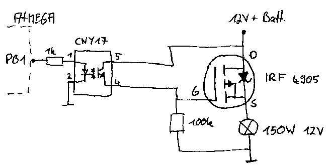 Hi, wollte an eine Atmega 8 ein Optokoppler mit Mosfet hängen, dieser schaltet dann eine Lampe mit 150W 12V. Nun mein Frage: Ist die Schaltung richtig demensioniert ?. Oder mach ich grad ne Denkfehler ? Fehlen noch Bauteil ? Brauche kein PWM usw, ist nur zum ein/aus schalten gedacht ! Relais kann leider nicht verwand werden. Danke... Gruß Bernt Datenblätter: Opto CNY17-1 http://mitglied.lycos.de/cvbasfgeersvx/CNY17.pdf Mosfet IRF4905 http://mitglied.lycos.de/cvbasfgeersvx/IRF4905.pdf PS: Entschuldigung für den schlechte Schaltplan :)