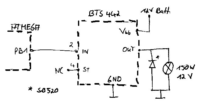 Hallo Bernt, der Optokoppler muss natürlich nicht sein. Aber falls Du ihn nimmst (deine erste Schaltung), musst du noch einen Gatewiderstand in Reihe setzen: +12V -- Opto -- Gatewiderstand -- Gate. Der Gatewiderstand muss den Strom auf max. 5mA begrenzen, d.h. er sollte schon mindestens 1.2k bis 1.5kOhm haben. Wenn du direkt an den Port gehst, brauchst du den R nicht (im BTS ist schon einer eingebaut). Im Eingang des BTS sitzt eine 6.1V-Zenerdiode. Deshalb müsstest Du bei größerer Eingangsspannung den Strom auf eben unter 5mA begrenzen. Klar? Gegen Störungen durch den Einschaltstrom hilft: AVR kompakt aufbauen mit eigener Stromversorgung und gut gesiebten Regler. 100nF direkt am AVR (zwischen + und Gnd). BTS auch dicht am AVR anschließen: Gate an den Port, Gnd vom AVR mit dem Gnd vom BTS verbinden. Deine +12V (dicke Leitung) an Vbb (Pin3) vom BTS , die Lampe an Out (Pin5) und an Gnd von der 12V-Quelle (auch dicke Leitung). Falls deine dicke 12V-Quelle auch deinen AVR speist, 12V und Gnd einzeln zu deiner AVR-Schaltung führen. Schau dir mal das Bild auf Seite1 vom BTS-Datenblatt an, da ist Signal-Gnd gut vom Load-Gnd getrennt. Noch ein Tip: zwischen Gate und Signal-Gnd würde ich (ob mit oder ohne Optokoppler) noch einen 47k Ableitwiderstand (10k oder 22k geht auch) setzen. Vorteil: wenn der AVR irgendwie abschaltet, wird sein Port evtl. hochohmig und das Gate hängt in der Luft und fängt sich Störungen ein. Mit dem Ableitwiderstand wird die Lampe zuverlässig abgeschaltet. Viel Erfolg Wolfgang