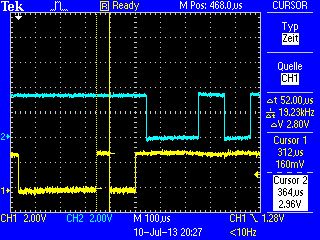 Michael A. schrieb: > Der Schrott entsteht meist bei der Interpretation > der Zeichen, nicht beim Senden. Ok, überredet: sieht weniger nach einem Taktproblem als eines der UART aus. Die UART-Register bin ich noch nicht im Detail durchgegangen. Anbei ein Screenshot vom Oszi, der gelbe Kanal ist ein Space mit 19200N81 vom PC gesendet, der XMEGA empfängt und sendet das interpretierte Zeichen auf blau zurück. Das passt nicht, umd das Terminalprogramm des PC zeigt Schrott. Danke erstmal, die ASF scheint da doch keine große Hilfe. Jedenfalls nicht bei der UART-Initialisierung.