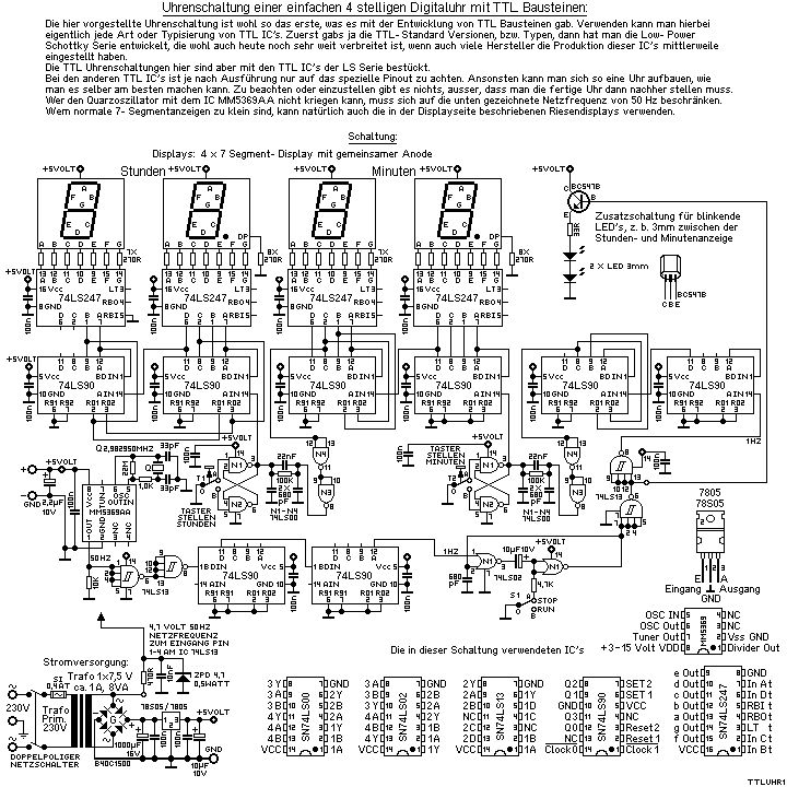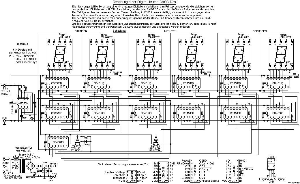 Erstmal vielen Dank für die Antworten. Also ich bin schon mehrere Tage auf der Suche nach einem Schaltplan einer Digitaluhr . Entweder mit LCD Display oder 7-Segmentanzeigen. Und das war das einzigste was ich gefunden habe. Aber was ich noch dazu sagen muss , ich habe schon eine cmos digitaluhr mit Quarztaktgeber gebaut . Also sollte die neue Uhr unbedingt mit der 50Hz Netzfrequenz getaktet werden weil ich das unbedingt mal ausprobieren will. Vielleicht hat ja einer von euch noch nen guten Link oder schaltplan für mich .