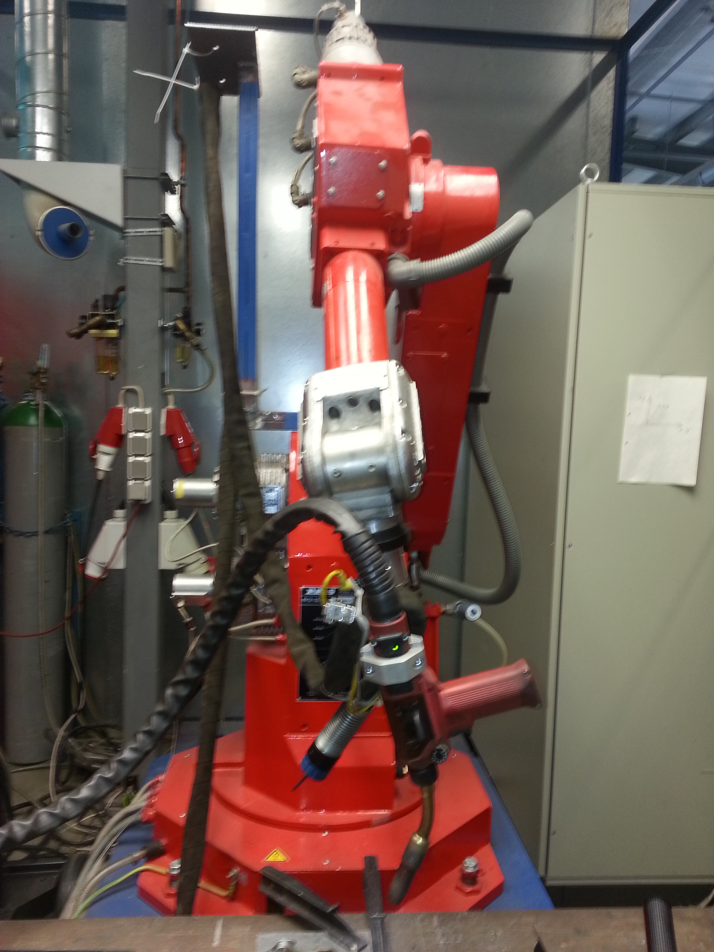 Hier mal ein Bild von dem Schweißroboter. Er besitzt alle sechs Freiheitsgrade: Wenn das Drehen des Fotos um 90 Grad nicht funktioniert, dann deutet es an. Danach würde ich es noch mal in richtiger Ausrichtung versuchen zu posten.