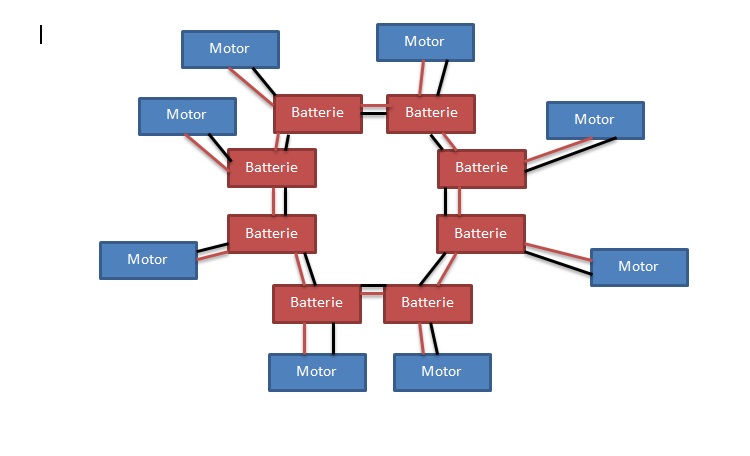 ok ich versuche mit Präziser zu fassen. Es handelt sich um 5S Lipo akkus mit 3000mAh. Die Motoren sind Brushless Motoren von Robbe, die bei höchster Belastung 56A pro Motor benötigen. Weiter sind es 8 Motoren und 8 Akkus. Wenn ich nun alle Akkus Parallel schalte in einem Punkt können im Extremfall 448A auf den Knotenpunkt wirken. Wenn ich nun die Akkus so Verbinde wie auf der Skizze, kann es dennoch sein dass auf die Einzelnen Leitungen Ströme von über 56A fließen? Was genau heißt die Akkus entladen sich nicht gleichmäßig? Wodurch werden die Akkus davon abgehalten?