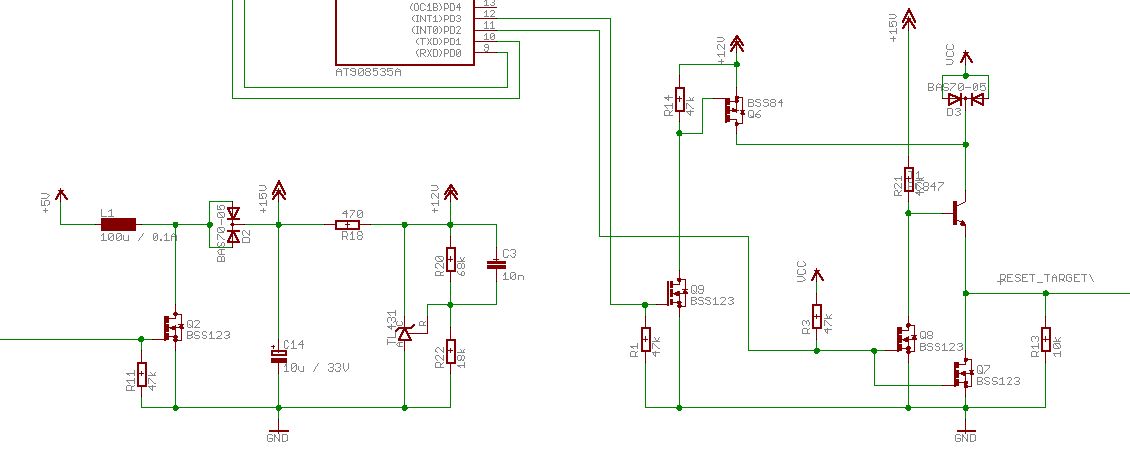 Hallo! Ich bin gerade dabei mir ein wenig Gedanken über einen HV Programmierer für die kleineren AT89Cx051 zu machen. Laut Datenblatt muss Reset je nach Programmierschritt mit 5V bzw. 12V beschaltet werden. Ich habe in Eagle mal eine Idee aufgezeichnet mit einigen Standart Transistoren, die ich hier noch in der Schublade habe. Das linke "Kabel" kommt von einem Pin des Programmierenden Controllers und soll 5V an den RST Pin vom 8051 geben. Das mittlere ist die besagte Leitung zum RST Pin vom 8051 und das rechte soll 12V auf den RST Pin geben. Würde das ganze so funktionieren oder hab ich da gleich was grundsätzliches falsch gemacht? mfg Thorsten