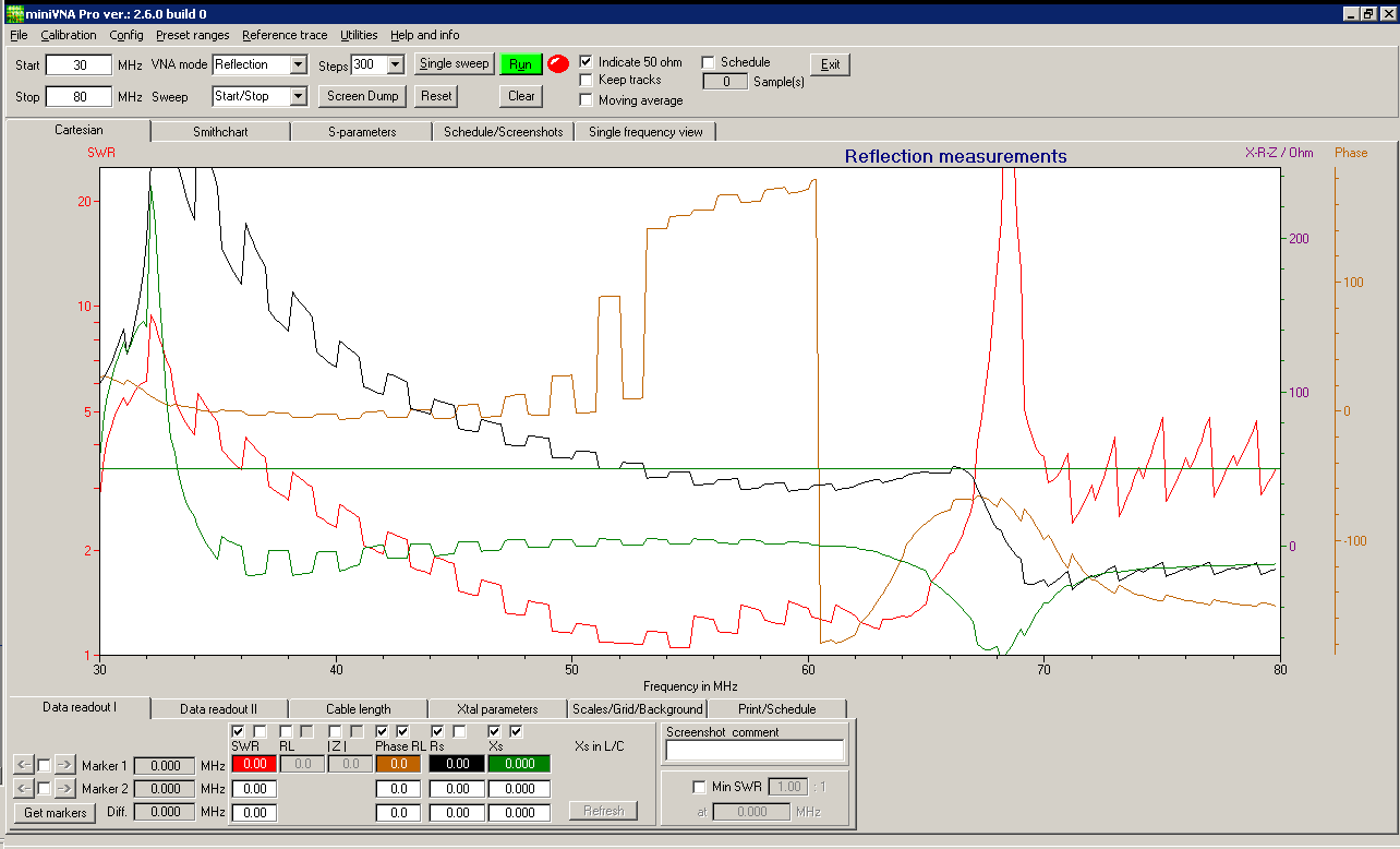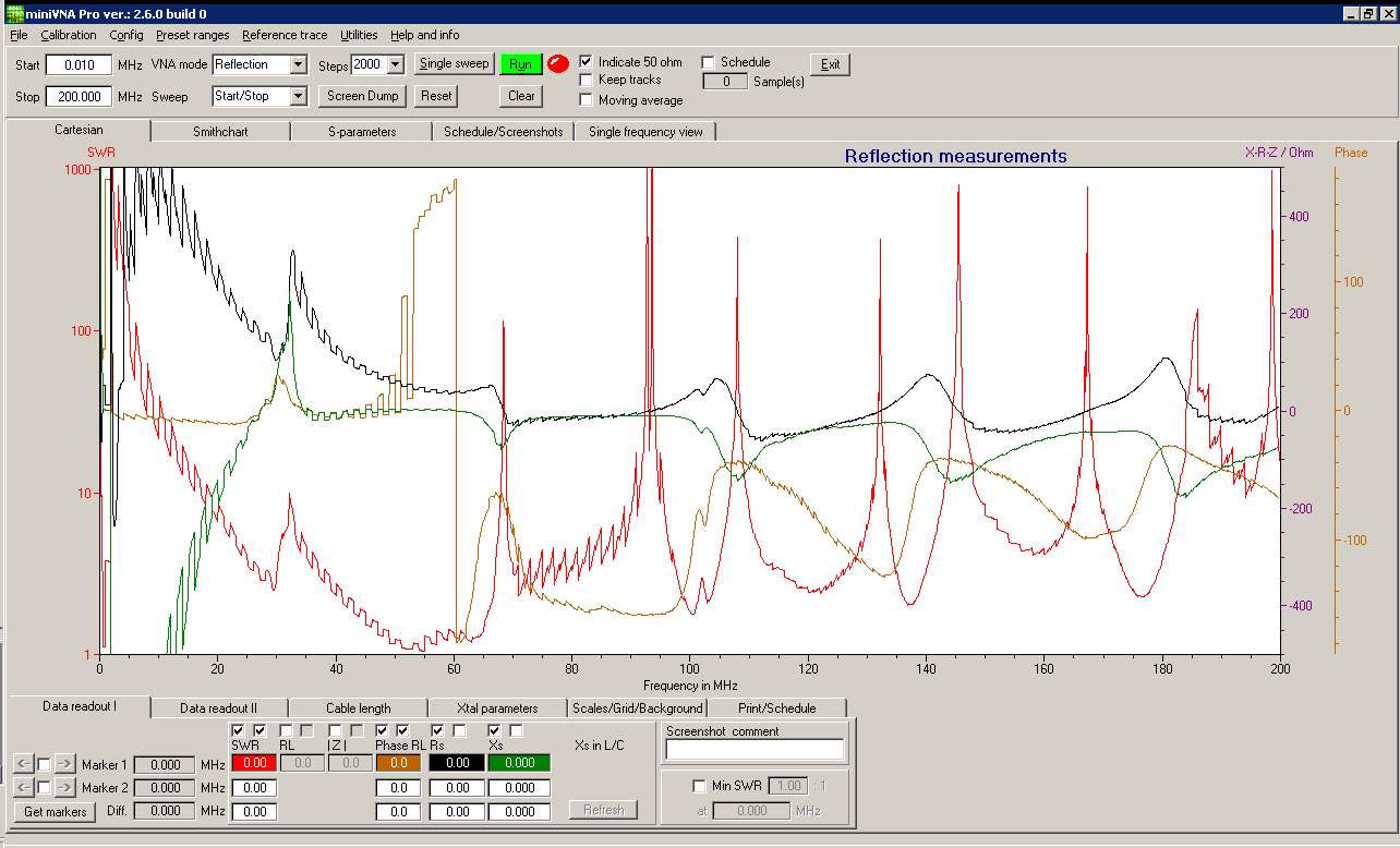 Hallo, ich versuche soeben eine einfache Reflexionsmessung mit einem Mini-VNA pro Netzwerkanalysator. Als Versuchsstrecke ist eine Litze mit ca. 5 Metern Länge angeschlossen. Nun entdecke ich im Meßergebnis so eigenartige Stufen (Rechtecke) bis zum Phasensprung bei ca. 60 MHz. Darüber sieht man Zacken (Dreiecke). Weiß jemand, woher diese Stufen und Zacken kommen? Danke! Beste Grüße, Nino.