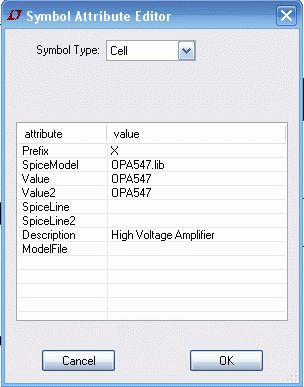 Hallo Christian, Warum schaust du das Symbol im Texteditor an. Das ist total überflüssig. Symbole editiert man im Symboleditor. Prefix X SpiceModel OPA547.lib Value OPA547 Value2 OPA547 Description High Voltage Amplifier Gruß Helmut