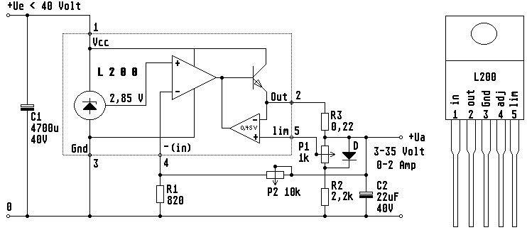 Sorry, vorhin mußte es schnell gehen ;-) P2 bildet mit R1 einen Spannungsteiler und führt Ua zum L200. Also: Spannungseinstellung. R3 ist der Shunt für die Strommessung, der liegt zwischen + und - des internen Operationsverstärkers. Die Spannung wird über P1 einstellbar reingeführt. Der obere Transistor regelt bei steigendem Strom dann runter und bewirkt eine Strombegrenzung.