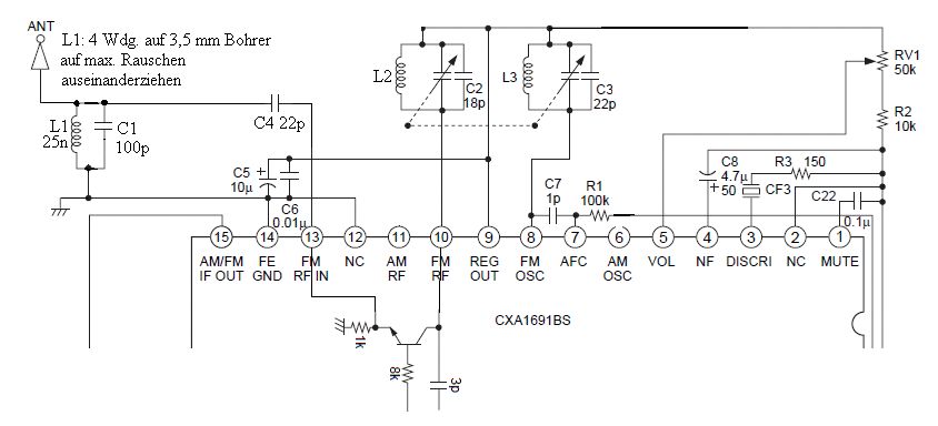 Ich weiss nicht ob mir hier einer helfen kann; ich versuche ein UKW-Radio ohne Bausatz :-) zu bauen mit dem CD1691CB IC (baugleich Sony CXA1691, Datenblatt zB hier http://www.futurlec.com/Sanyo/CXA1691.shtml). Leider bekomme ich nur lautes Brummen und Quietschtöne aus dem Lautsprecher! Ich vermute, dass zum einen der Oszillator und der RF-Schwingkreis nicht genau 10,7 MHz auseinander liegen ?! Und / oder dass die beiden Schwingkreise generell auf falscher Frequenz schwingen. Der Bandpass-Filter ist ja wohl nicht so wichtig um überhaupt einen Sender zu hören? Die OSC-Spule (siehe Bild) und die RF-Spule habe ich genau wie in einem funktionsfähigen Radio mit gleichem IC gewickelt - 0,6 mm Draht, Durchmesser 4mm, Wicklungen siehe Bild. Beide Kreise haben einen 18 pF Kondensator und den Drehko (ausgebaut aus Billigradio, genau wie den Diskriminator und den anderen Keramikfilter). Ich habe leider KEIN Oszilloskop!