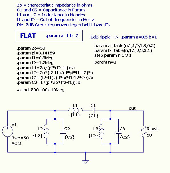 Danke an Helmut. Was macht der table Befehl bzw. Parameter ? Die Hilfe kann table nicht finden. Genauer was macht dieses Konstrukt ? .param a=table(n,1,1,2,1,3,0.5) .param b=table(n,1,1,2,2,3,1) .step param n 1 3 1 .param n=1 Ist die Bezeichnung LC Pi-Filter der allgemein gebräuchliche Begriff für diesen Filter ? Welches Verhalten hat dieser Filter (Butterworth,Bessel etc) bzw. in welche "Schublade" kann ich diesen Filter stecken ? An DerAlbi. Leider habe ich mir die Quelle nicht aufgeschrieben. An Herbert. Wer ist Wippermann ? Habe es noch nicht ausprobiert, aber bringt es was einfach nach Wippermann zu googeln. Tut mir leid wenn der Herr Wippermann nicht jedem bekannt ist.