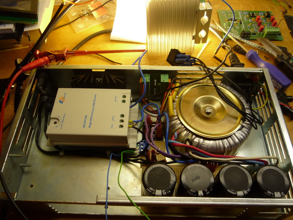 So Leute...erstmal THX an den anderen Bastler Die Entscheidung war richtig, Habe das Modul ( 20v AC ) ca 28V DC gespeist der KSQ lässt sich ziemlich gut über den Stromregler einstellen. bei 2.00 A LED Strom sind es ca 32.5V am Ausgang und bei 2.5A ca 33 V. In den vorderen Bereich kommt dann der Controller rein mit der 4 x 20 LCD Anzeige und dann noch eine schöne Frontplatte...