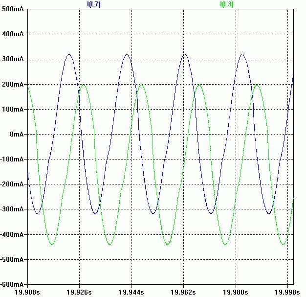 Nur zur Klarstellung. Die Simulation benutzt einen nicht sättigenden (linearen) Trafo. In Wirklichkeit würde durch den mittleren Gleichstrom der Trafokern in Sättigung gehen was hohe Stromspitzen bewirkt die das Brummen verursachen. Um das zu simulieren müsste man ein nichtlineares Trafomodell benutzen. Die vorherige Simulation macht trotzdem Sinn. Sie zeigt, dass man mit der AC-Kopplung (Kondensatoren) gen Gleichstrom in der Trafowicklung vermeiden kann.