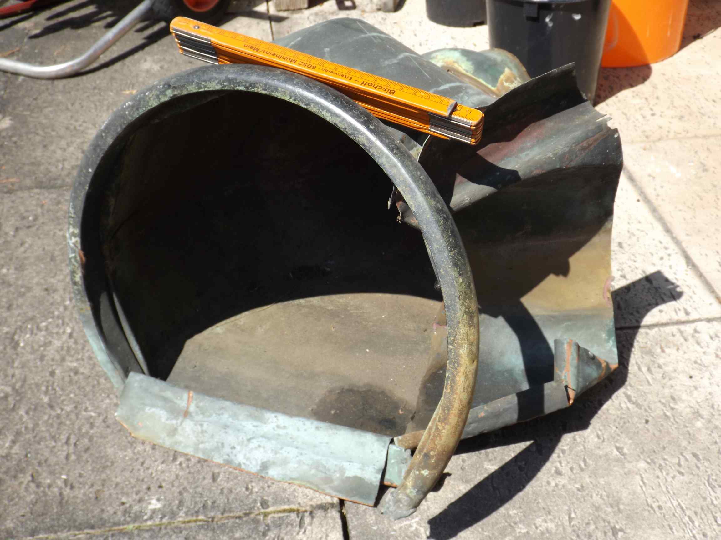 Habe einen alten Wasserkasten aus Kupfer, der als Verbindungsstück zwischen Dachrinne und Fallrohr diente. Ich überlege nun, ob ich es entsorgen sollte oder ob ich es herrichten sollte z. B. als Trockenblumenkübel oder so etwas. Das Teil ist bei der Demontage natürlich etwas verböllert worden (Ja, ich habe es ganz offiziell von der Dachdeckefirma bekommen. Nein, es stammt NICHT von einer Finanzierungsaktion osteuropäischer Wanderarbeiter!). Die Oberfläche ist mir Grünspan bedeckt, ist ja auch Kupfer. Zudem sieht man so ne Art Rost an einigen Stellen. Ich habe versucht, den Grünspan mit Autopolitur wegzubekommen, aussichtslos. Chemische Behandlungen sollen wohl auch nicht so dolle sein, da sie sofort neuen Grünspan nach sich ziehen. Sandstrahlt man so etwas?
