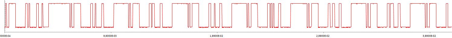 Hallo, erst mal vielen Dank für die Antworten. Das Signal müsste man stimmulieren können, da der 80C51 Daten von einer RS 485 Leitung bekommt. Ich vermute mal, dass 1 Byte große werte übertragen werden. (Die Platinen sind von 1992.). Werden keinen RS 485 Daten empfanen,sendet der 80C51 auch nicht. Zu den Pins: 80c51 (Sender) ist über Pin 15 (P35/T1) mit dem 89c52 verbunden. Der 89c52 empfaängt auf Pin10 (RXD). Beim Sender ist der TXD Pin unbeschaltet. Deshalb würde ein Software UART wenig sin machen, da man TXD Pin benutzen könnte. Sämtliche Versuche das Signal mittels UART bzw. invertieren UART zu empfangen schlugen fehel. Wenn meine Vermutung richtig ist, dass es sich bei dem 104 µs Signal (das kleinste Signal im Oszillogramm) um das Startbit handelt, dann ist der Frame ca. 6 ms lang.