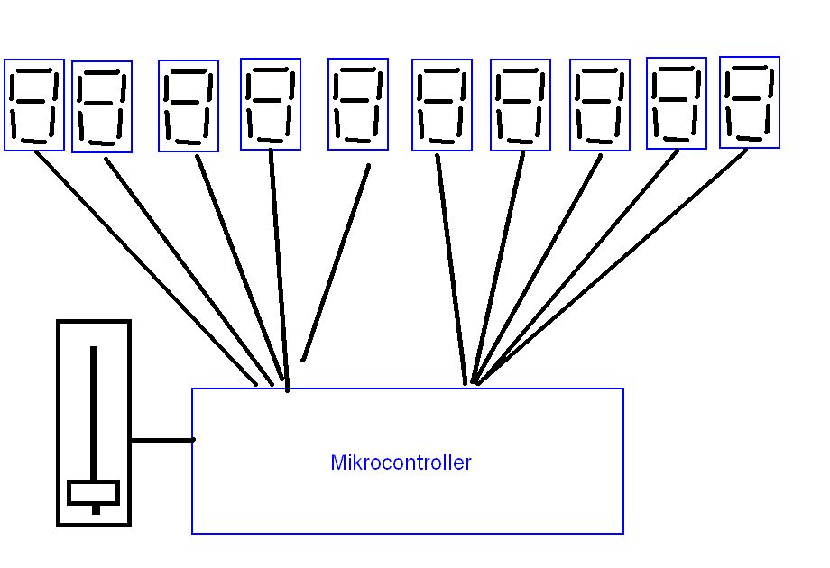Anbei ein Bild, wie ich mir Eure Aufgabe vorstelle. Am besten "malst" du auch mal so ein Bild, damit klar ist, was Ihr eigentlich benötigt. Eine Schieberegler wird an einen Controller angeschlossen (SPS/Mikrocontroller), analog oder digital. Der Controller wertert das aus und gibt auf den 10 7-Segmentanzeigen Zahlen aus. Die 7-Segementanzeigen sind entweder einzeln an den Controller angeschlossen (viele Pins nötig) oder werden über einen Bus/Schnittstelle angesprochen. Ist das, was Ihr haben wollt? Am besten erstellt Ihr für das Projekt erst mal ein Lastenheft, also eine Aufzählung was das Ziel ist. Dann könnt Ihr in die Details gehen und überlegen wie das Problem gelöst wird. Dieses "Lastenheft" könnt Ihr dann auch nutzen um hier Anregungen zu bekommen.