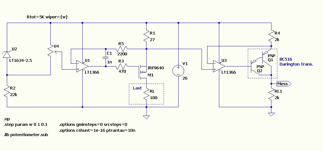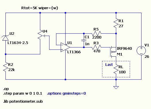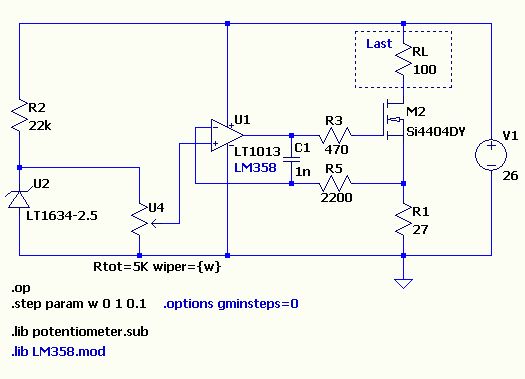 Hallo Oliver, deine bisherigen Schaltungen haben Designfehler. pkanal: Opamp muss ein Rail-in und Rail-out Typ sein. Der variable Widerstand muss ein Spannungsteiler oder ein Potentiometer sein. Den Kompensations-Kondensator einbauen wegen der großen Eingangskapazität des Mosfets. nkanal: Opamp muss ein Single Supply Typ sein der am Eingang bis 0V geht und am Ausgang nahe 0V kommt(LM358) oder ein Rail-in/Rail-out Typ sein. Der variable Widerstand muss ein Spannungsteiler oder ein Potentiometer sein. Den Kompensations-Kondensator einbauen wegen der großen Eingangskapazität des Mosfets. Gruß Helmut