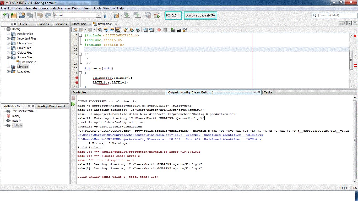 Hallo Könnte mir bitte jemand sagen warum mein einfacher Code nich funktioniert bzw warum mein Compiler nicht mit dem Befehl TRIS klar kommt? Ich verwende: dsPIC33FJ256MC710A MPLAB X IDE CCS PCD Compiler dsPICDEM MCLV Development Board mfg