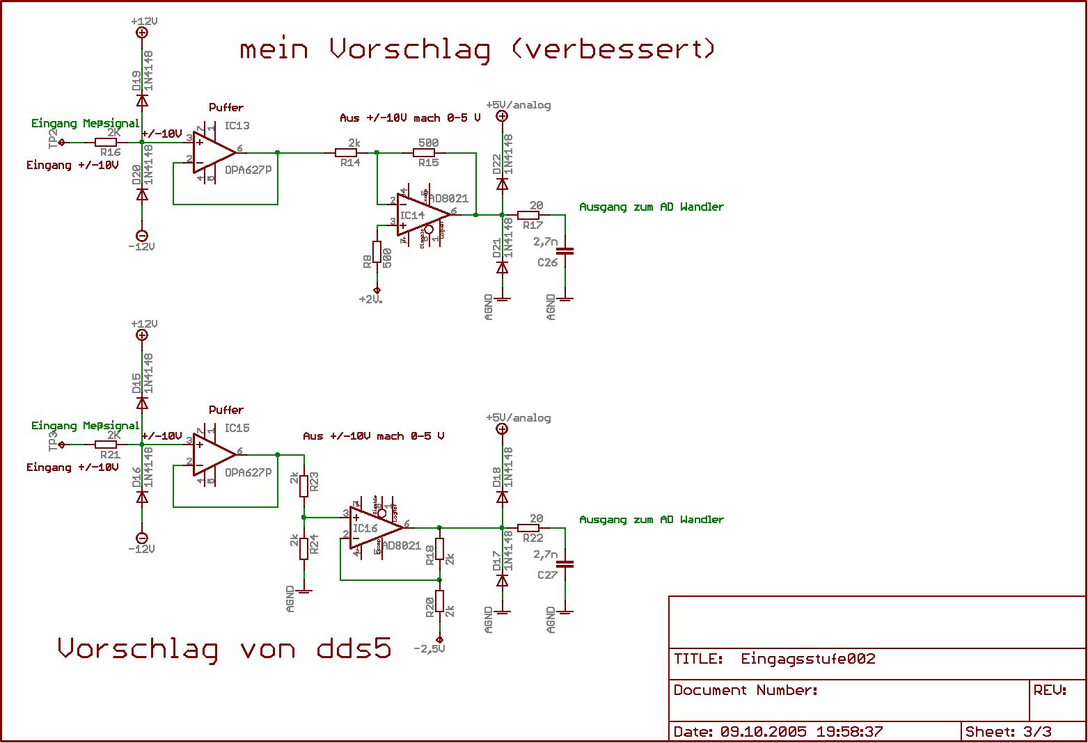 Ich habe jetzt den Fehler berichtigt - ohje, bei solchen Fehlern hat man Tomaten auf den Augen ;) Ich habe jetzt zwei Vorschläge (s. Anhang) Bei dem Vorschlag von dds5 habe ich das Problem mit der Dimensionierung der Wiederstände und der Erzeugung einer Spannungsreferenz von -2,5V. Welcher Vorschlag ist nun besser? Ist bei dem Vorschlag von dds5 das Problem mit dem Rauschen oder der schlechteren Bandbreite größer? Euer moin