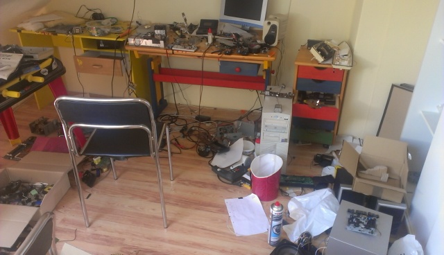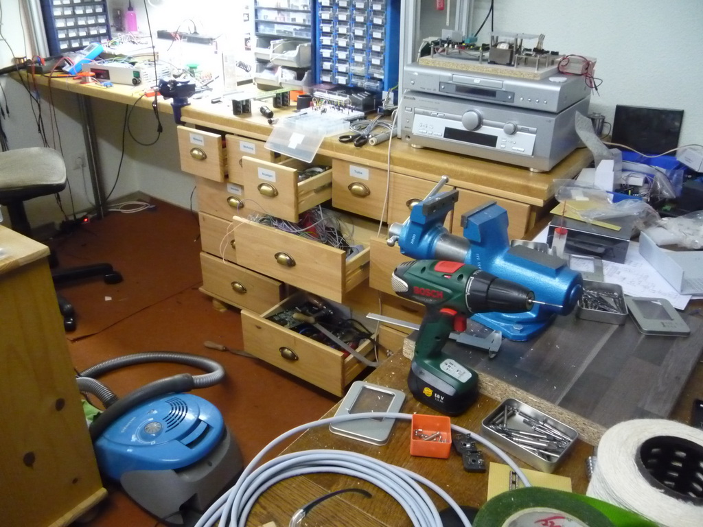 Das DMM habe ich mal geschenkt bekommen. Das wurde aus der Werkstatt meines Vater ausgemustert, weil die Isolierung an einer Messleitung eingerissen war. Ich weiß nicht, ob man es gut erkennt, aber rechts steht noch ein weißer Schrank, den ich mal einräumen könnte.