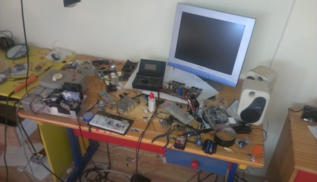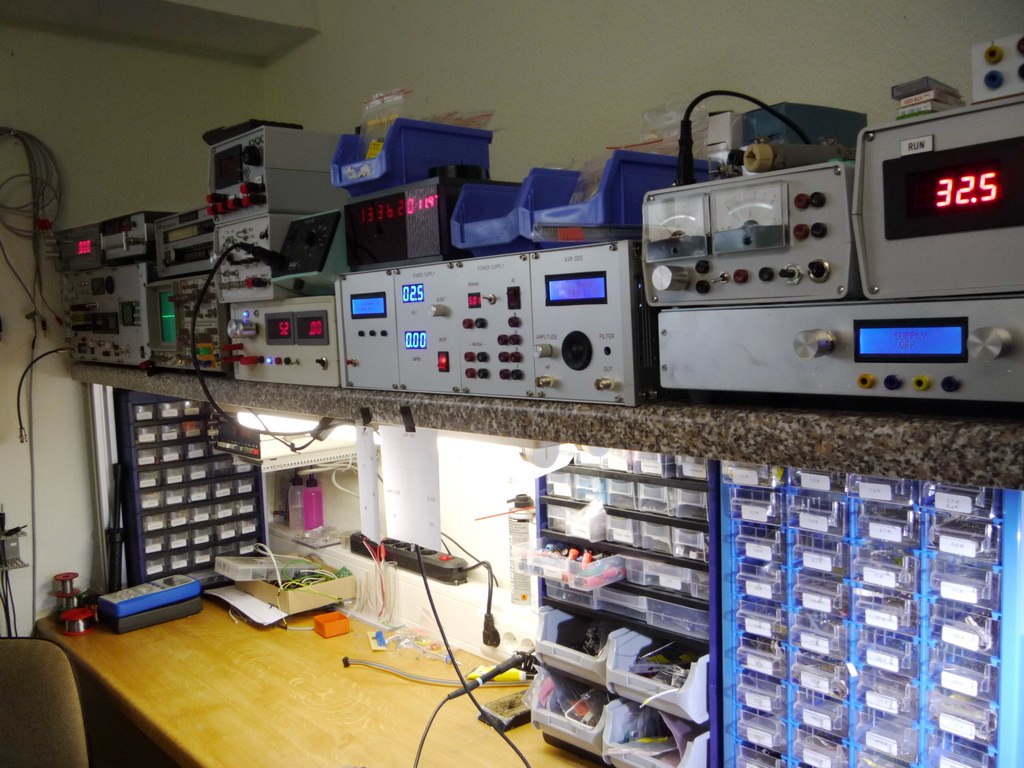 Bis auf dem Oszi, Sinusgeneartor von Grunding und der einer Frequenzzähler ist alles selbergebaut.. Achso noch der Multimeter unter der Platte ist von RFT