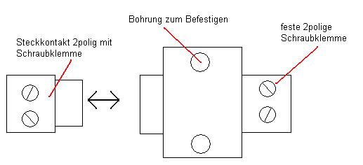 Hallo, ich suche eine Schraub-Klemme mit folgenden Eigenschaften: 1. eine Seite Steckkontakt 2polig mit Schraub-Klemme 2. andere Seite fix Schraubklemme 2polig mit Schraub-Klemme (kann zur Not auch wie 1. sein, also steckbar) 3. senkrechte Bohrungen, um das ganze mittels Schrauben auf einem Brett montieren zu können (also nix mit Print-Montage). 4. Schraubklemmen für einen Querschnitt von bis zu 1,5mm². Ich hab mal ein Bild angehängt, wie ich es mir ungefähr vorstelle, hoffentlich könnt ihr mit der Zeichnung was anfangen. Wäre super, wenn mir jemand weiterhelfen könnte. Danke. Ralf